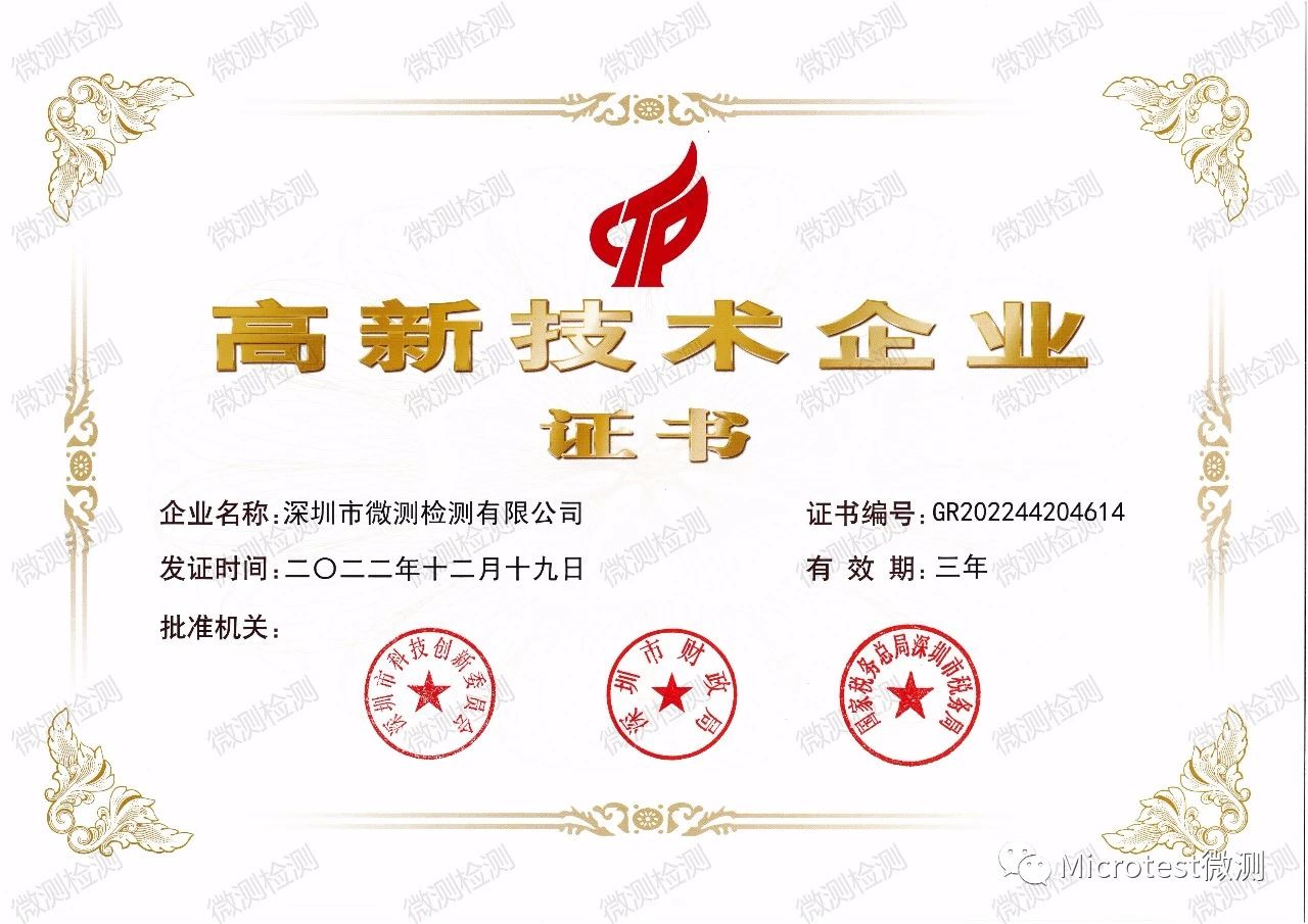 近日,深圳市微測(cè)檢測(cè)有限公司再次獲得由國(guó)家稅務(wù)總局深圳市稅務(wù)局、深圳市科技創(chuàng)新委員會(huì)、深圳市財(cái)政局三部門(mén)聯(lián)合頒發(fā)的國(guó)家級(jí)《高新技術(shù)企業(yè)》證書(shū),連續(xù)榮獲國(guó)家“高新技術(shù)企業(yè)”稱(chēng)號(hào),充分體現(xiàn)了微測(cè)檢測(cè)領(lǐng)先的技術(shù)創(chuàng)新能力、技術(shù)研發(fā)能力和經(jīng)營(yíng)管理水平。