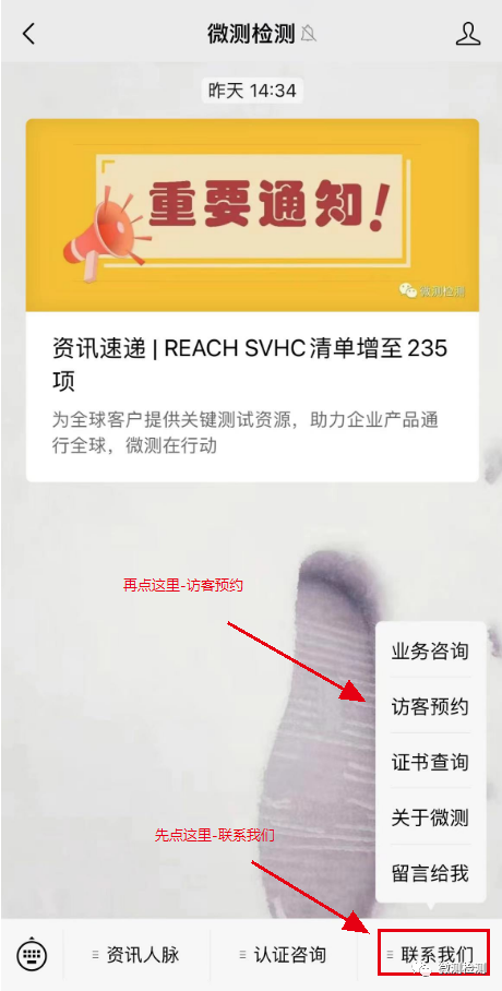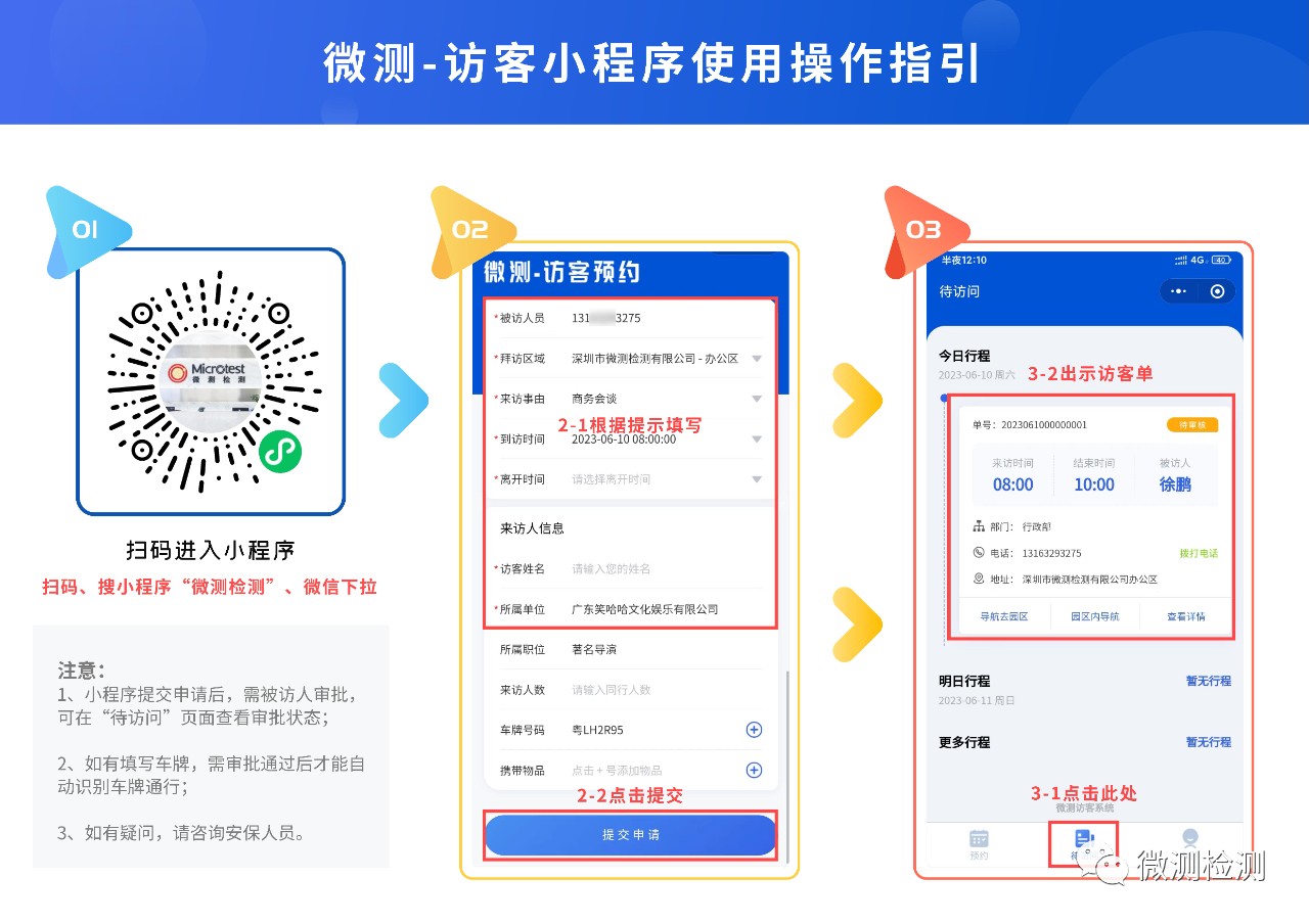 尊敬的客戶,我們非常高興地宣布,微測訪客預約小程序已經上線啦!訪客預約小程序為您提供更加便捷、快速和高效的服務。現在,您只需要打開微信,在搜索框中輸入“微測實驗室Microtest”,就能找到我們的小程序,也可前往微測公眾號,在公眾號中進行“訪客預約”。