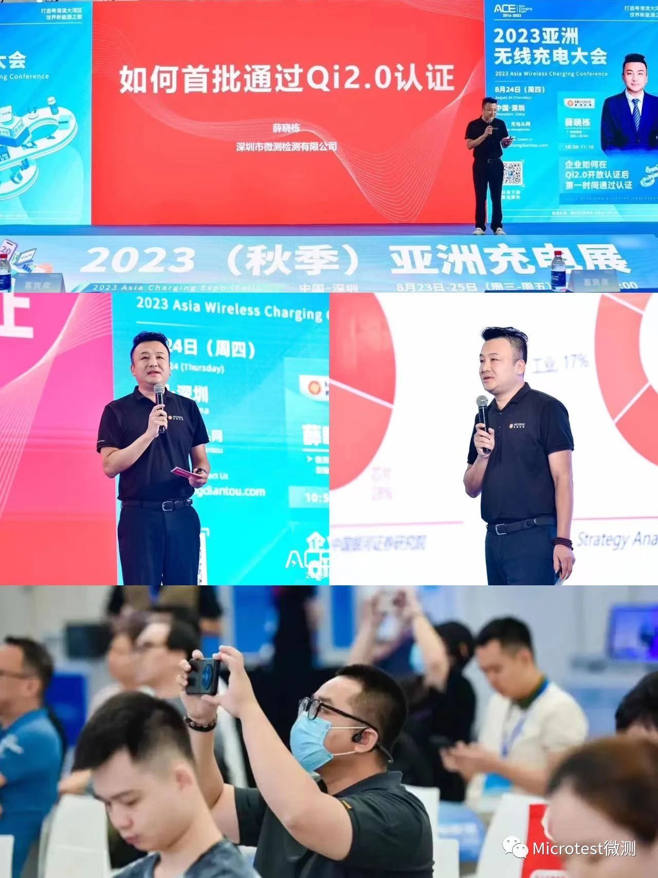 2023年8月23-25日,Microtest微測檢測參加了由充電頭網舉辦的2023(秋季)亞洲充電展,展位號B104。并于8.24日上午進行主題演講,分享主題為《如何首批通過Qi2.0認證》為大家帶來詳盡的解決方案。