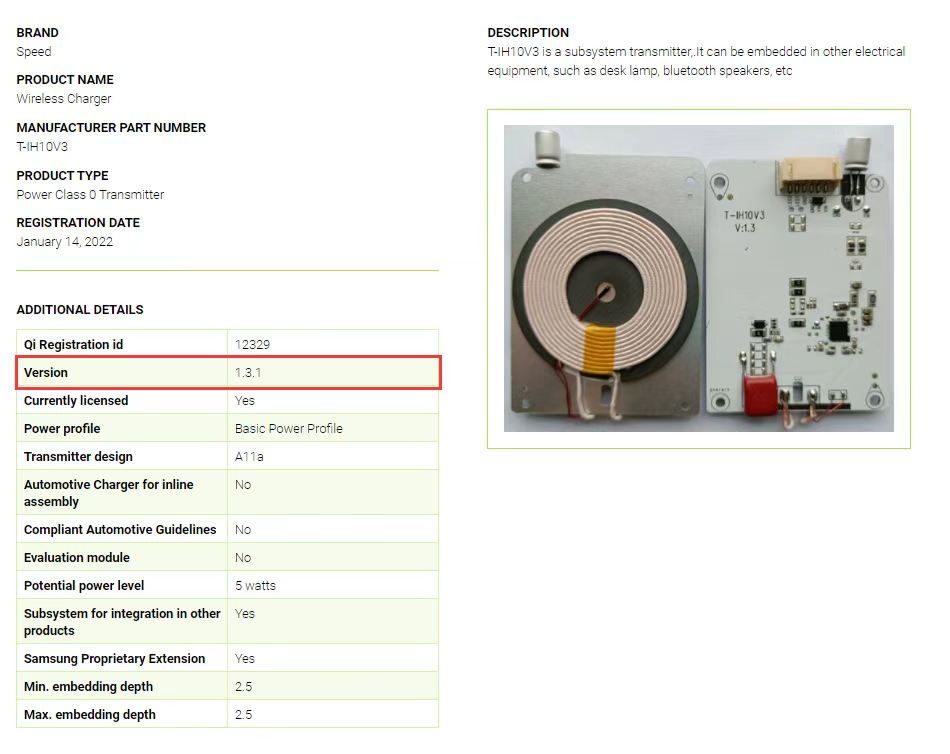 2021年10月我司聯合深圳英集芯科技股份有限公司,協助惠州碩貝德無線科技股份有限公司,進行Qi1.3.1 開發與測試,據WPC官網顯示,這款無線充電器產品于2022年1月14日成功完成認證,榮獲全球首個Qi 1.3.1 證書。