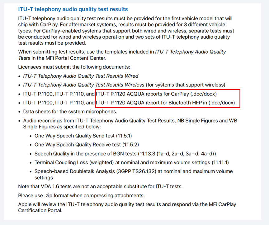 根據《CarPlay Certification Guide February 2021》的更新文件要求,在2021年2月份之后,P1120已作為需要提交認證的項目,加入測試。在2021年8月份之后,已強制執行,如果需要通過CarPlay認證,則ITU-T P.1120測試是必不可少的。