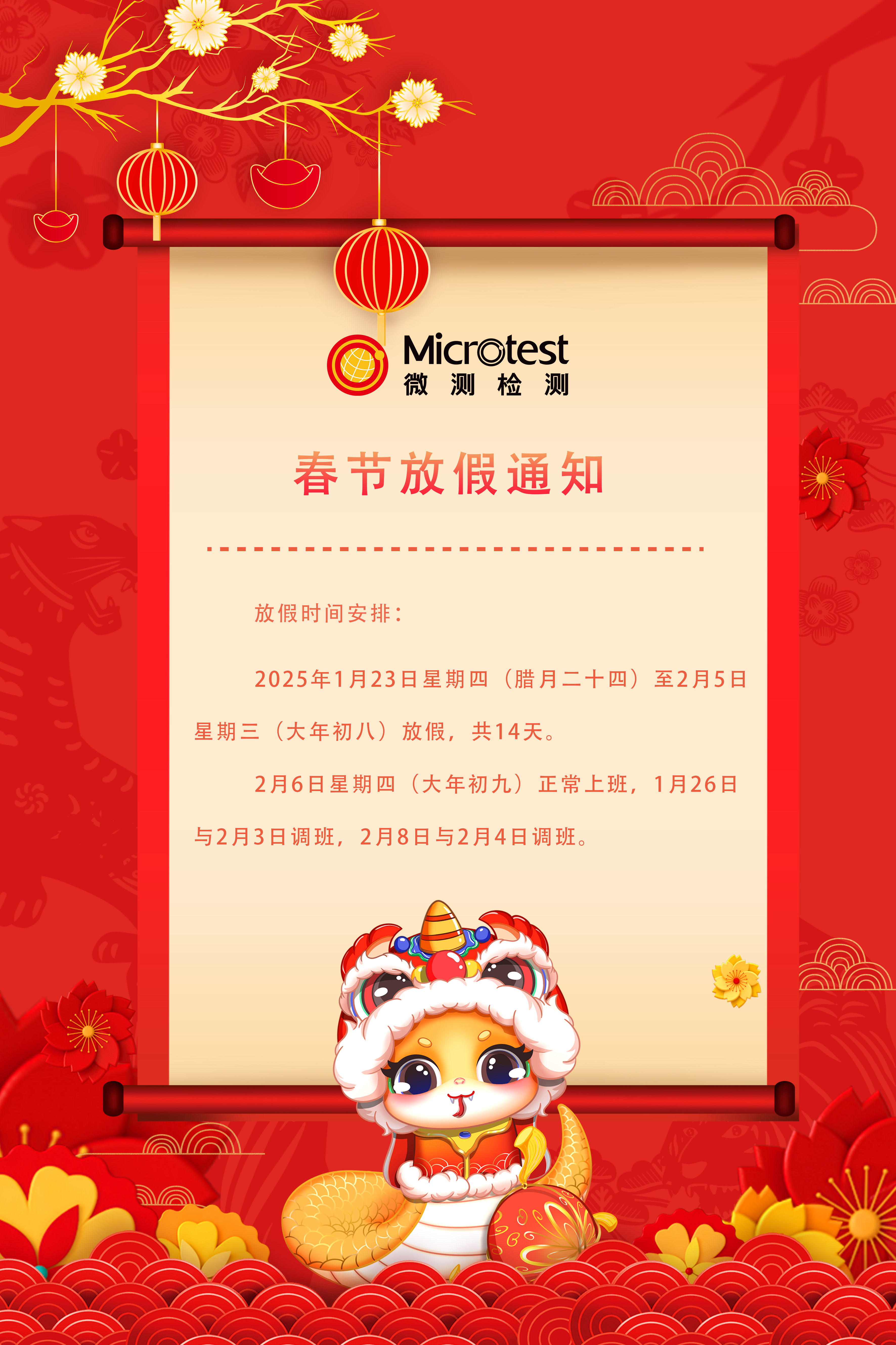 2025年春節假期將至,根據國家節假日放假規定,我司放假安排如下:放假時間:2025年1月23日星期四(臘月二十四)至2月5日星期三(大年初八)放假,共14天。2月6日星期四(大年初九)正常上班。1月26日與2月3日調班,2月8日與2月4日調班。放假期間相關項目交期將會順延,詳情請聯系業務對接人。因放假給您帶來的不便,敬請見諒。預祝大家新春愉快、闔家幸福、萬事勝意!業務咨詢熱線:131-4343-1439(微信同號)專線郵箱:mti@51mti.com