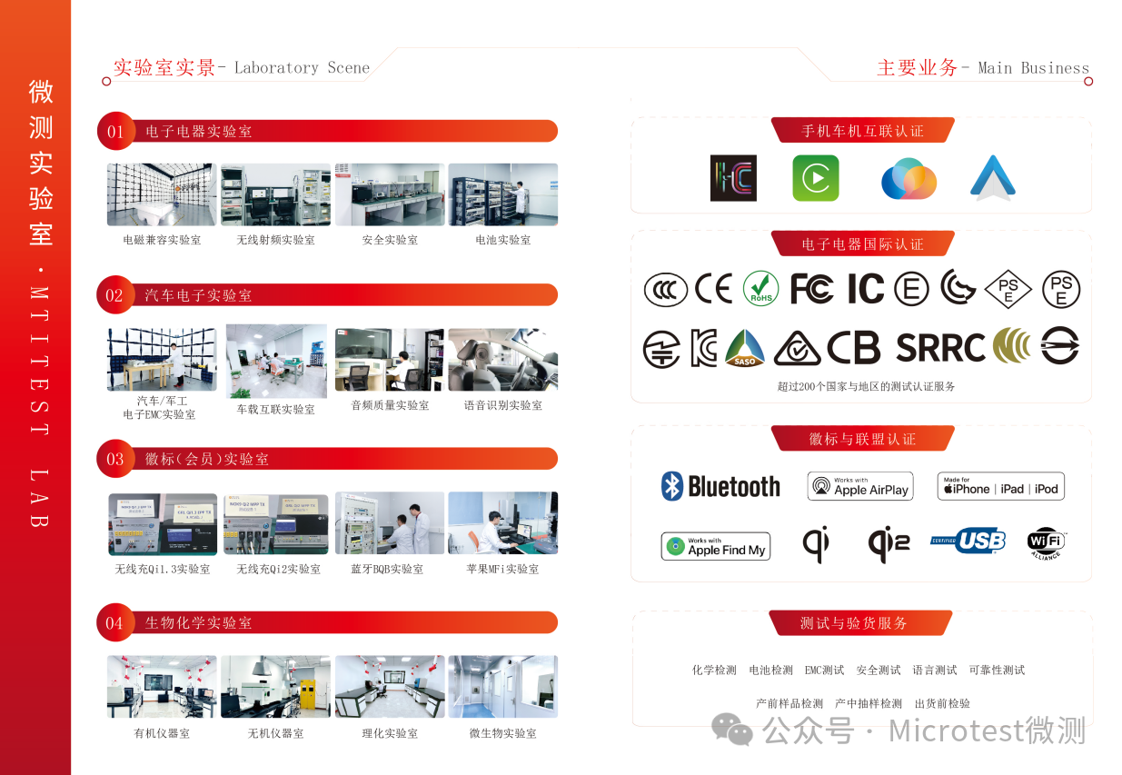 公司擁有20余個專業(yè)實驗室,128人的工程師團(tuán)隊,10000㎡檢測科技園,獲得了CNAS、CMA、A2LA、CBTL、WPC、Bluetooth SIG等授權(quán)和認(rèn)可。公司可為企業(yè)提供全球上百個國家的測試與認(rèn)證、驗廠與驗貨服務(wù),包括華為HiCar、無線充Qi、藍(lán)牙BQB、蘋果MFi等眾多授權(quán)認(rèn)證服務(wù)。無論企業(yè)身處何地,無論產(chǎn)品類型如何,微測檢測都能提供一站式解決方案,幫助企業(yè)順利進(jìn)入全球市場。