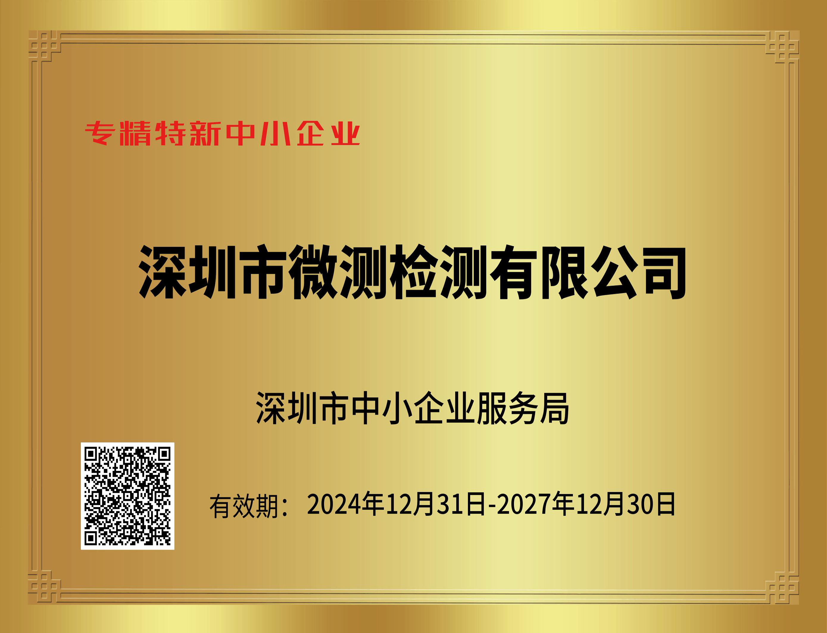“專精特新”中小企業(yè)是指具有專業(yè)化、精細(xì)化、特色化、新穎化等四大特征的中小企業(yè)。企業(yè)通常專注于某一特定細(xì)分市場,擁有獨(dú)特的技術(shù)或工藝,產(chǎn)品或服務(wù)具有較高的附加值和顯著的經(jīng)濟(jì)、社會效益。微測檢測憑借其在檢測認(rèn)證領(lǐng)域的專業(yè)專注、精益求精、獨(dú)特的技術(shù)優(yōu)勢以及持續(xù)的創(chuàng)新能力,榮獲“專精特新中小企業(yè)”稱號。