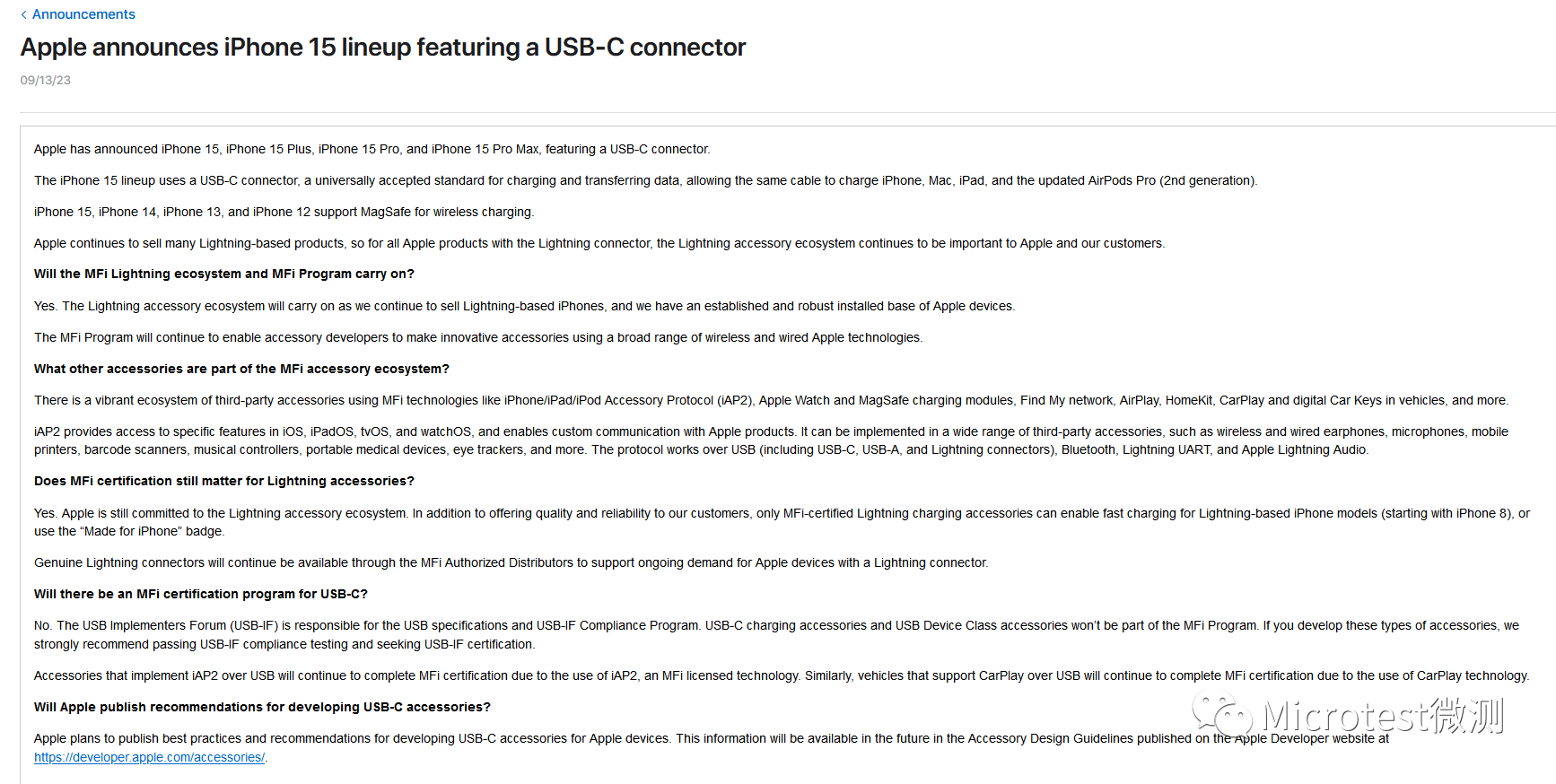 蘋果計劃發布為蘋果設備開發USB-C配件的最佳范例和建議。這些信息將在蘋果開發者網站https://developer.apple.com/accessories/中的配件設計指南(Accessory Design Guidelines)中提供。