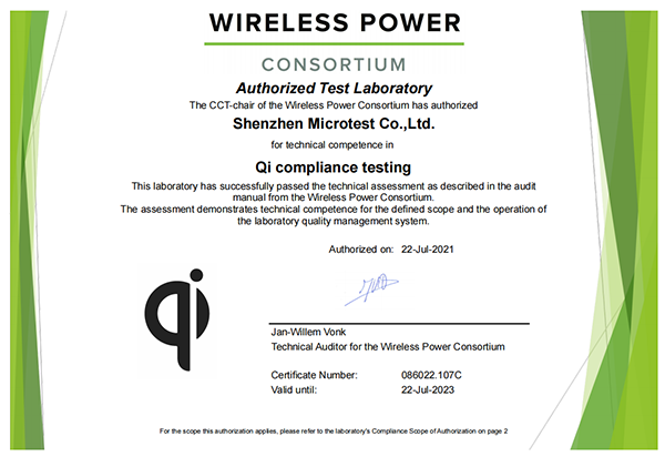 重磅來襲:微測檢測于2021年7月22日成功通過WPCQi1.3評審,成為中國大陸唯一獲無線充Qi1.3測試能力的ATL授權實驗室。