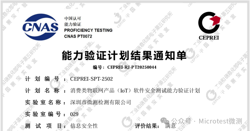 國家級能力驗證認可: 在工業和信息化部電子第五研究所(中國賽寶實驗室)組織的“消費類物聯網產品(IoT)軟件安全測試”能力驗證計劃中,Microtest微測檢測表現優異,獲得“能力驗證結果滿意通知書”。這進一步印證了其網絡安全技術實力在國內頂尖權威機構層面的充分肯定。