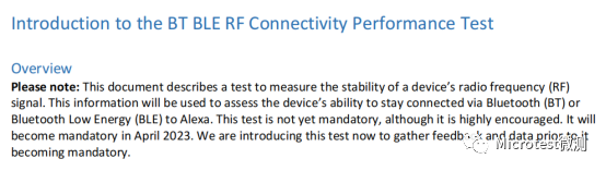 根據Amazon關于藍牙性能的文檔要求顯示,自2023年4月起,BLE-RF將成為部分類型產品的Amazon Alexa認證的強制測試項目。